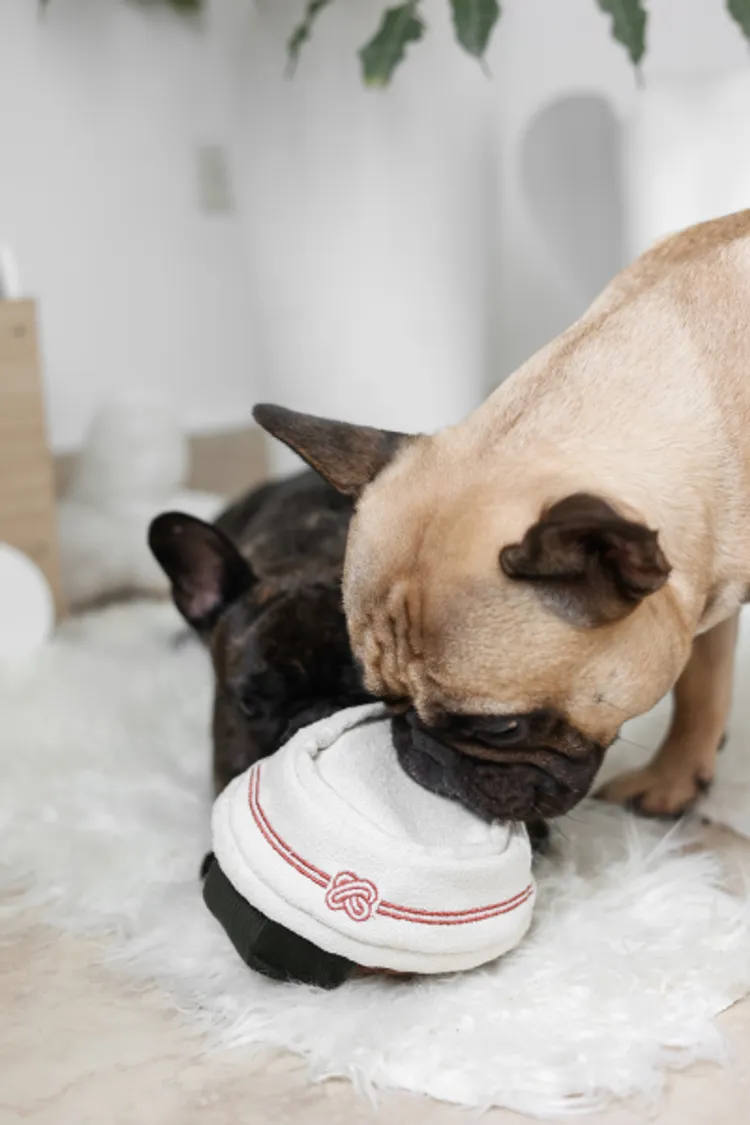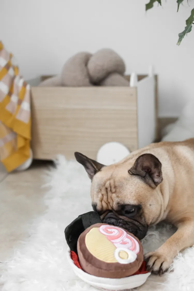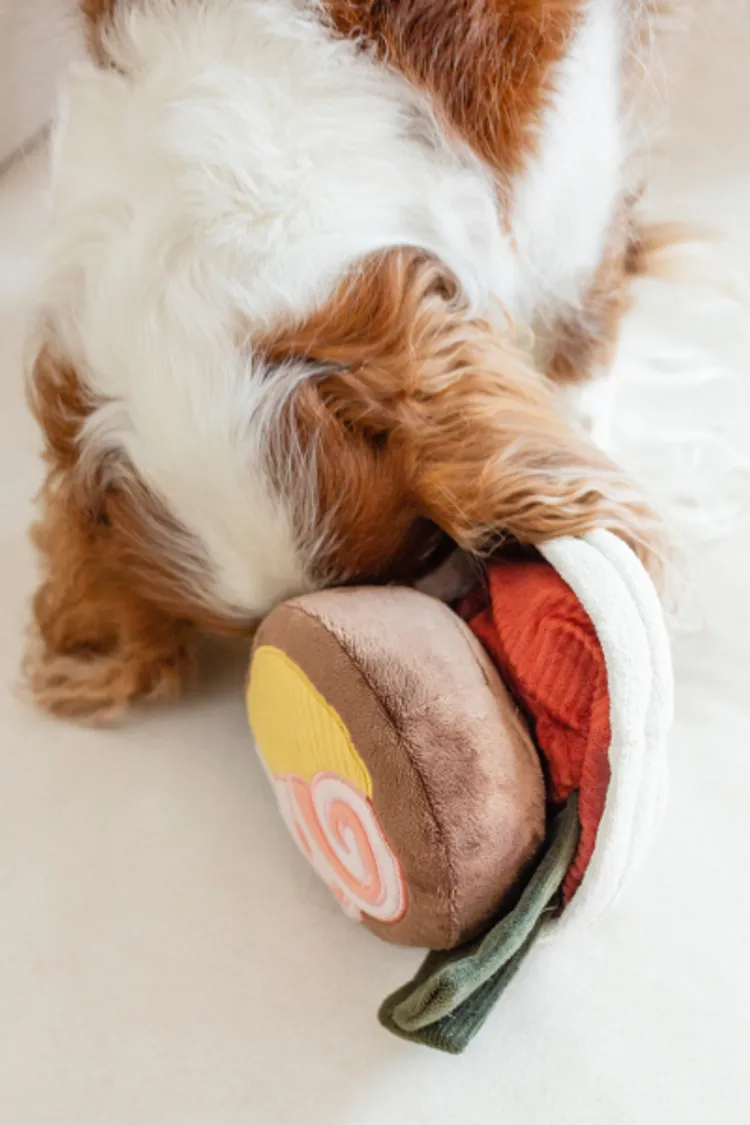 趣味聲響回饋: 麵條底座內置獨特的**「扁平鴨鳴發聲器 (Flat Duck-sound Squeaker)」,能發出逗趣的聲響;側邊裝飾的「海苔」則帶有響紙聲 (Crinkly)**,模擬真實食材的觸感與聲響。
