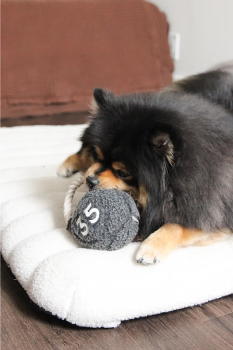 顆粒感羊羔絨布身 (Bouclé Body): 壺鈴主體採用具備獨特觸感的顆粒感羊羔絨 (Bouclé),提供豐富的嘴部摩擦感,滿足毛孩的啃咬渴望。