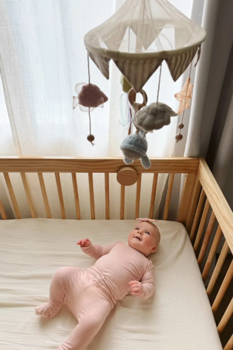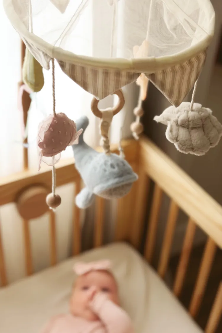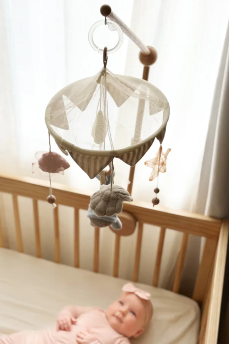 安裝要點:將吊飾穩固地固定在嬰兒床架或牆面支架上。