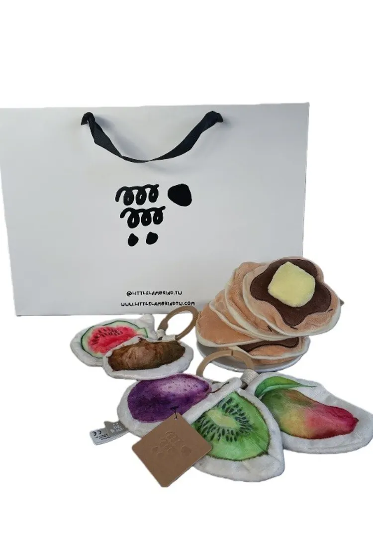 此組合含🥞鬆餅沙包*1、🥥水果圖鑑-響紙吊飾*1、品牌棉布袋*1、品牌紙袋(經典款)*1