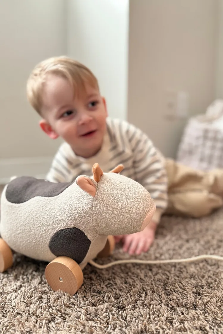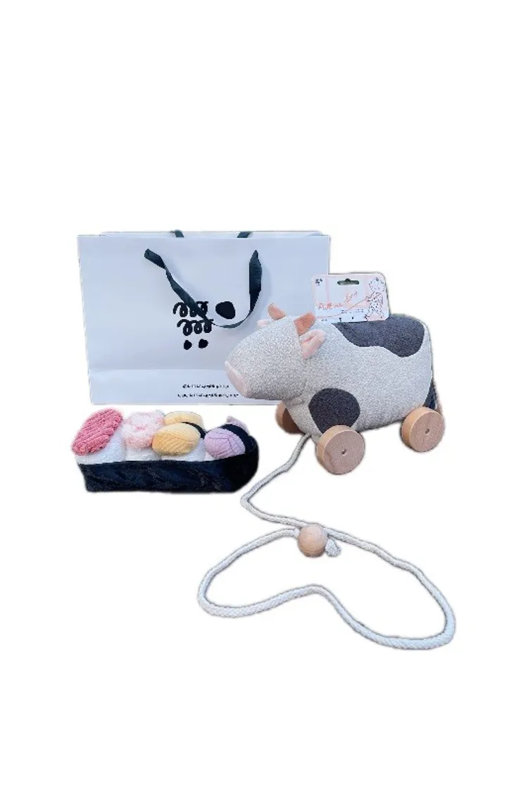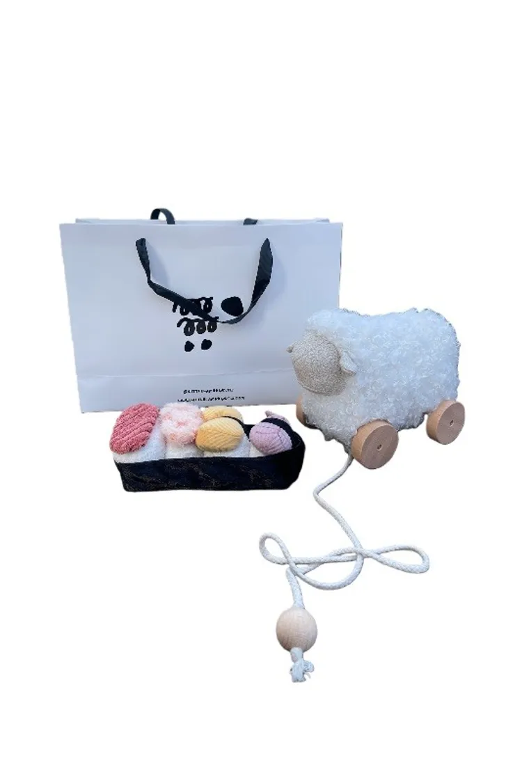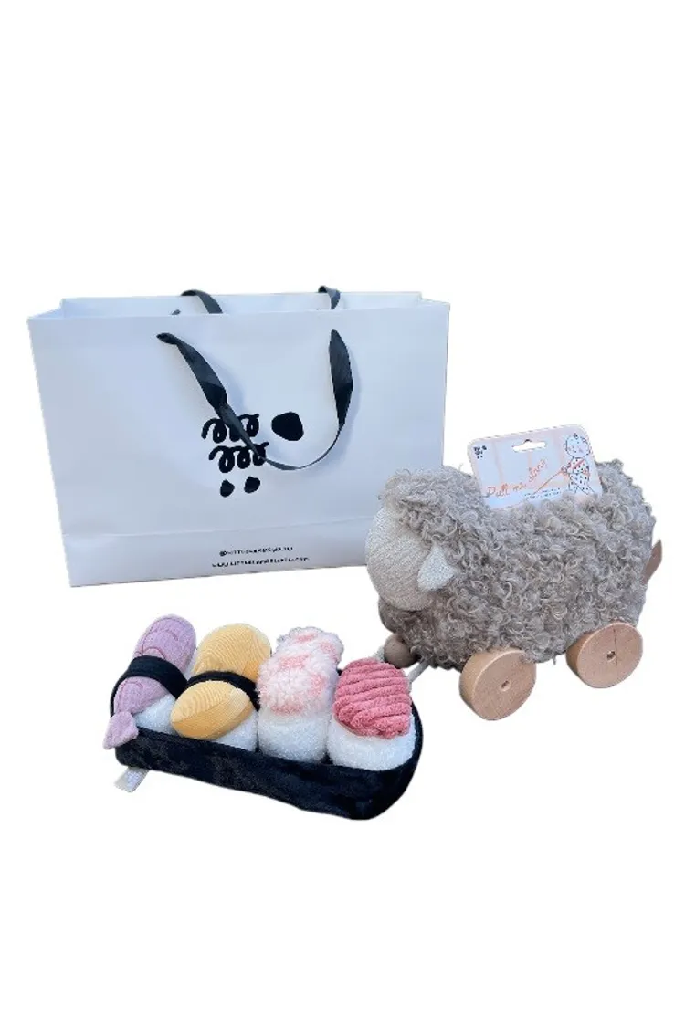 此組合內容物包含 :🐄🐏手拉車(貝拉蓬蓬羊-奶茶/貝拉蓬蓬羊-雪白/哞哞乳牛擇1)*1、🍣手捏握壽司*1、品牌棉布袋*2、品牌大款手提紙袋*1
